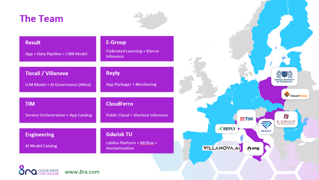 The answer is federation, one of the central concepts of ICRA v2.0, we put it into action. The AI comes to the data, not the other way around. Models are trained locally at the hospital edge. Insights are shared. Raw patient data never moves. But Ambiti8n goes further than privacy compliance. It is a complete application stack – spanning AI model orchestration, federated learning infrastructure, edge inference, sovereign language models, EU AI Act governance, monitoring, and multi-cloud deployment. It is delivered by eight specialist organisations across four European countries, each contributing a distinct, interoperable layer.